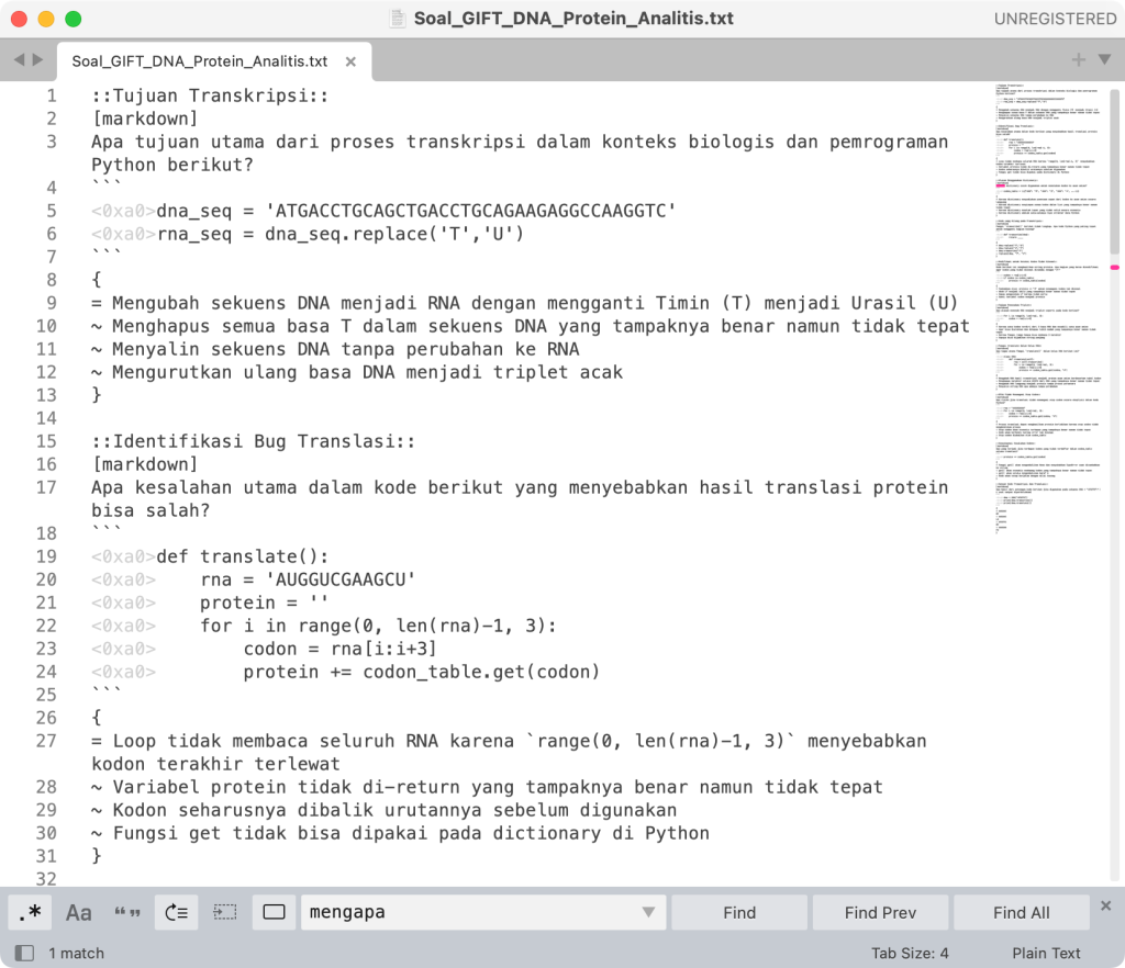 Namun, membuat soal dalam format GIFT secara manual tidak selalu mudah. Kita harus memperhatikan struktur tanda kurung, penanda jawaban, hingga masalah kecil seperti indentasi kode Python dan karakter khusus seperti { dan } yang dapat membuat file gagal diimpor jika salah penanganan.
